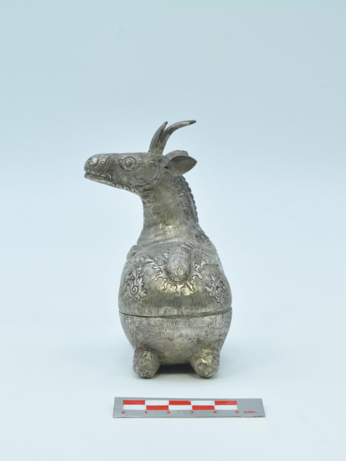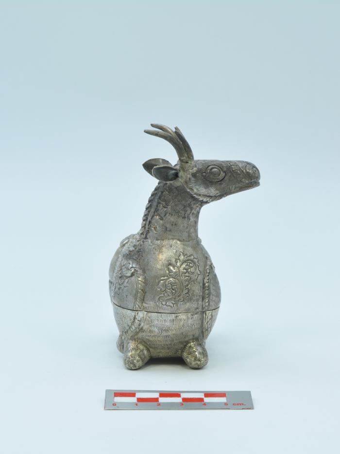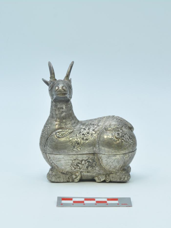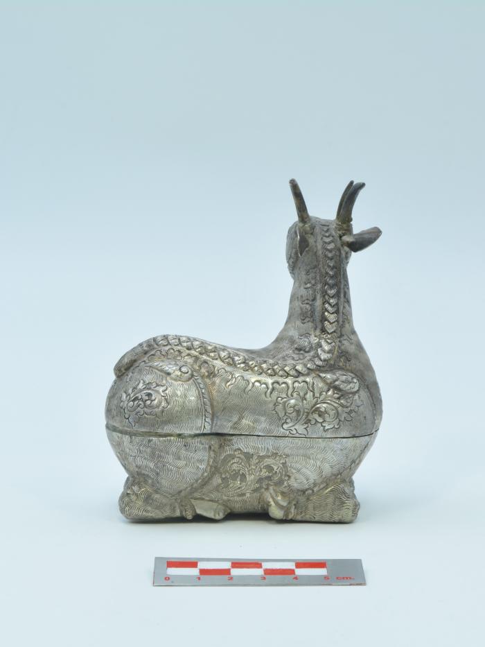 Descriptive Note คำบรรยายวัตถุ | ตลับเงิน เป็นรูปกวางหมอบ มี 2 ส่วน เปิดออกได้ ภายในเป็นที่ใส่ของ ตกแต่งลายเฉพาะด้านนอก สลักลายเป็นเส้นขนหยักเป็นคลื่นทั่วทั้งตัว ประดับด้วยลายใบไม้ม้วนที่กลางอก ลำตัว และสะโพก เน้นต้นขาด้วยลายคล้ายหางสิงห์ และทำแผงขนตลอดแนวสันหลัง |